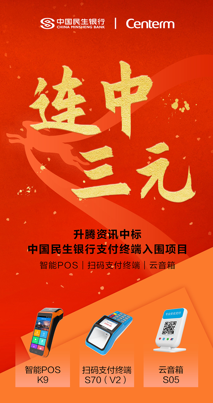 连中三元,捷报频传。近日,升腾成功中标中国民生银行2022年支付终端入围项目,中标产品覆盖包括智能POS、扫码支付终端、云音箱三大类型,迎来2023兔年开门红。
