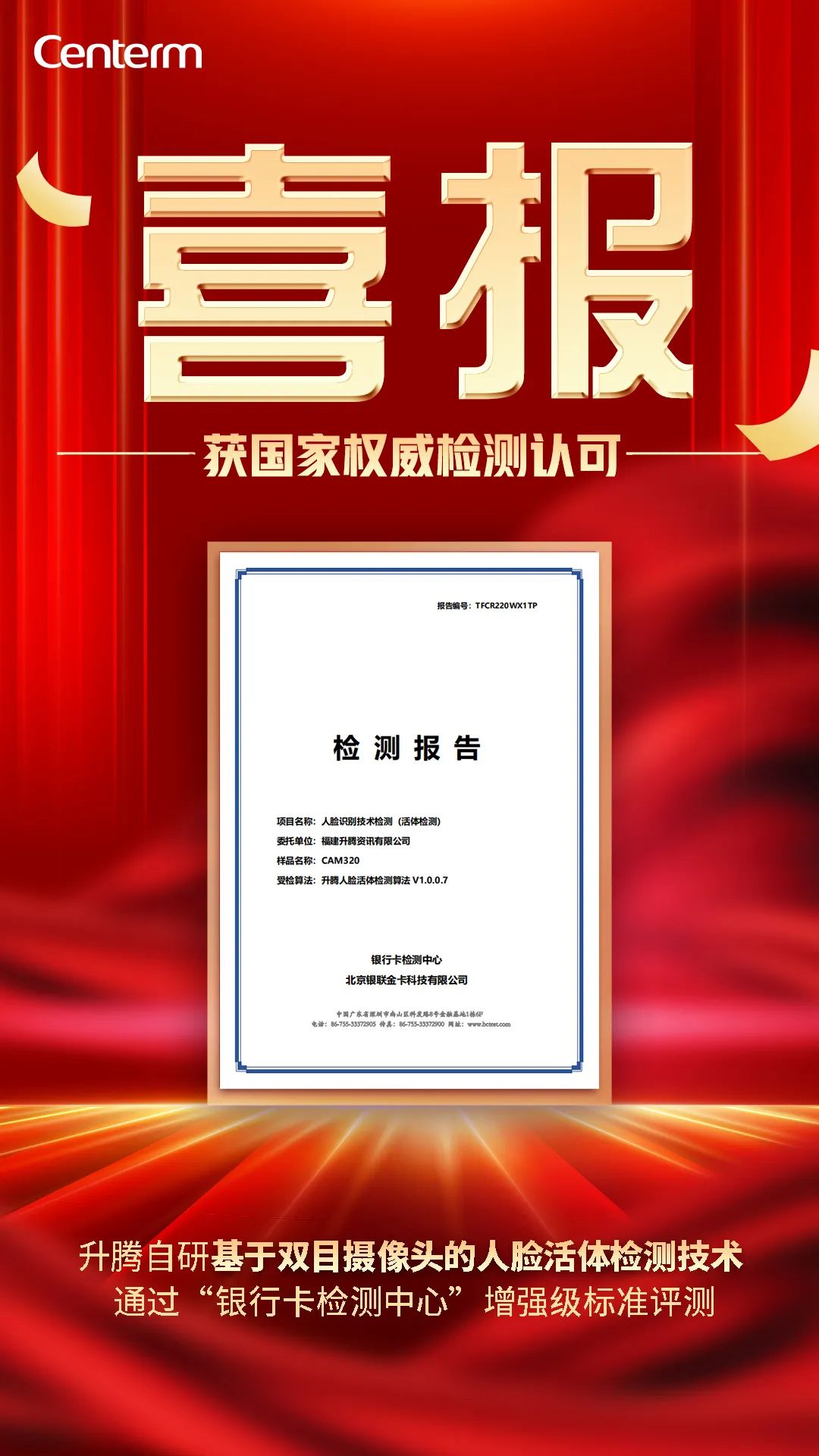 喜报速递!升腾资讯自主研发的“基于双目摄像头的人脸活体检测技术”,以卓越的表现成功通过金融行业国家级权威性检测机构——银行卡检测中心(简称BCTC)的严格技术检测。值得一提的是,这是国内金融领域唯一认可的产品检测。