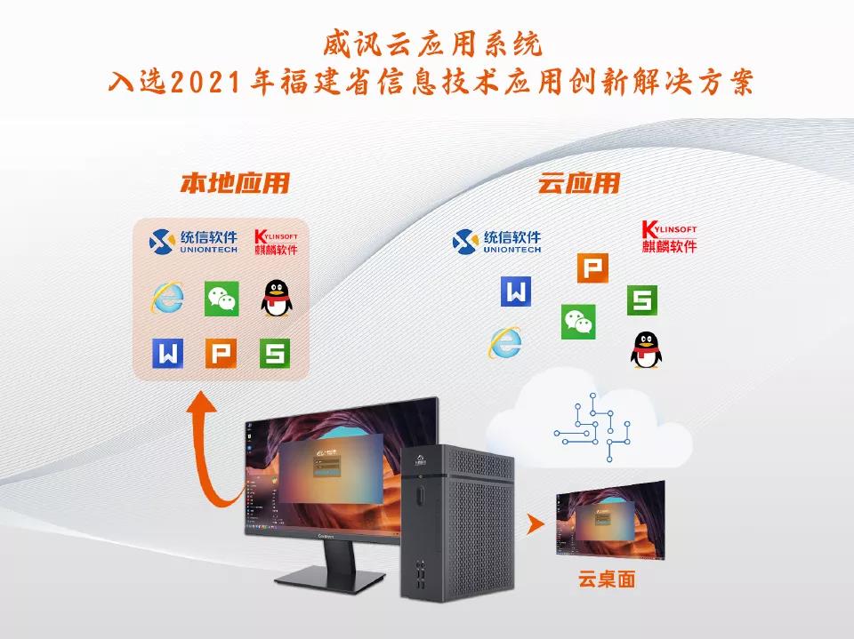 威讯云应用系统,是业界最早实现云应用迁移的方案,入选福建省信息技术应用创新优秀解决方案,是对升腾威讯在党政办公行业的信创建设中,为党政办公需求而打造的云应用方案价值的肯定。威讯云应用实现未完成改造的业务系统客户端或者第三方业务办公软件在云端部署,并且实现云应用系统与原有业务系统平台对接,在信创终端、信创操作系统访问云应用与本地应用一致体验,保障信创替代过程业务平滑迁移过渡。