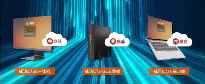 基于兆芯KX-6000系列处理器的威讯C73A一体机、威讯C73-G2云终端、威讯C7N笔记本。