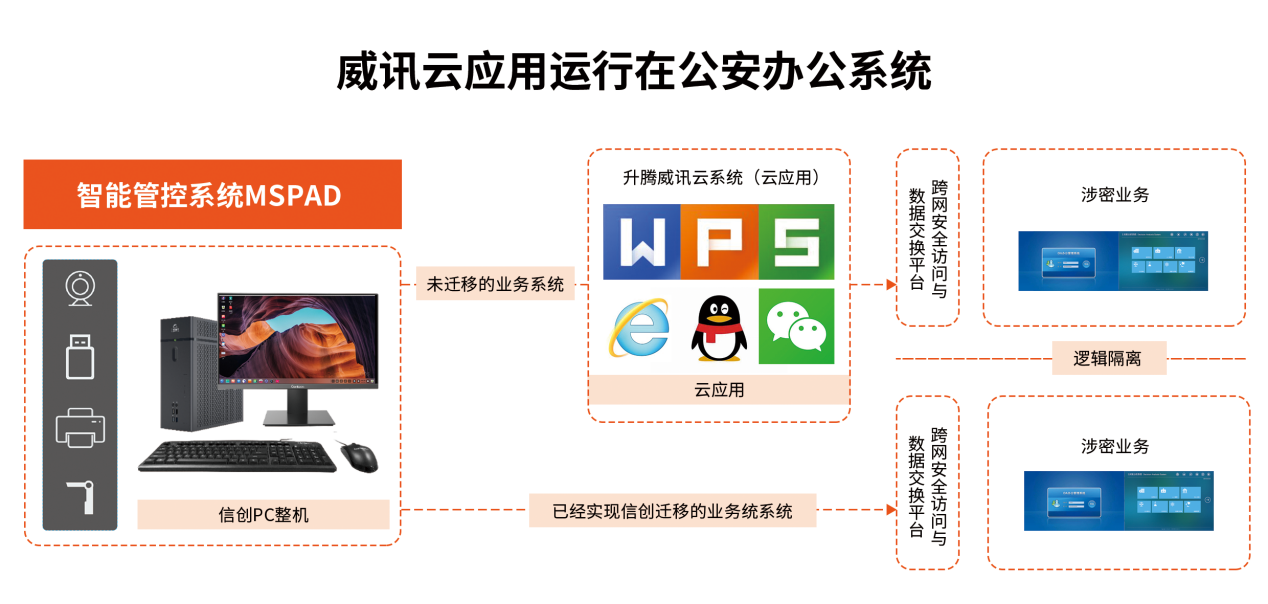升腾威讯结合信创指导方向,发挥自研桌面云技术优势,充分考虑现阶段国产操作系统兼容性,利用应用虚拟化技术将未完成改造的业务系统客户端或者第三方业务办公软件在云端部署,并且实现云应用软件与公安业务系统平台对接,在平台访问非改造业务时候自动启用云应用,保障在国产终端、国产操作系统上改造后的业务系统、未改造的业务系统均可运行,减少用户使用习惯的改变,保障业务平滑迁移过渡。