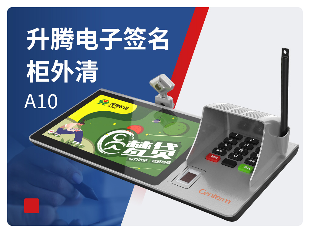 电子签名柜外清是业内领先的金融柜面专用设备,由升腾自研设计,取代了普通密码键盘、服务评价器、员工牌、手写屏等柜外设备,涵括了最新无纸化电子签名及信息交互、电子服务评价等多个功能,真正实现柜面设备一台清。