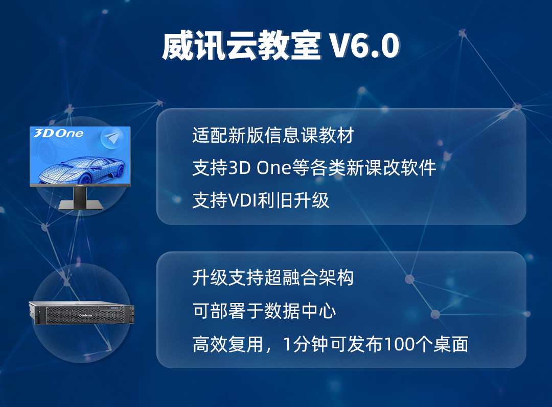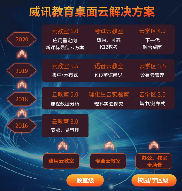 威讯教育桌面云方案通过统一架构,定制场景化方案,解决基础设施孤岛问题,为深度融合、智能创新提供必需的基础能力。在普教行业,产品矩阵从“普通云教室”、“专业类教室”、“云办公”、“云学区”等全方位升级,从电子教室、语音专业类教室、教师办公、到区县数据中心等不同场景应用进行更精准的细分,真正有效地实现教育信息化。