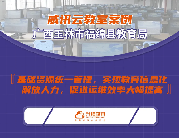 通过威讯云教室全面助力广西玉林市福绵县教育局信息化,为全县配备小学、初中计算机教室合计57间,落地2456点教师、学生桌面,全面推动全县计算机教室的云化,有效满足教育局全县教育资源的信息化管理,让运维人员从繁杂的维护琐事中得到解脱,教育局管理员全面、高效、动态地掌握学校综合信息。