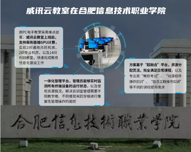 典型案例一:合肥职业技术学院是安徽省教育厅确立的省属首批16所地方技能型高水平大学(A档),是国家“创新发展行动计划”优质专科高等职业院校,学校建有安徽国家职业能力培训中心、国家职业技能鉴定站等机构。信息工程与传媒学院依托“微软技术实践中心”建设项目,新建4间实训室,并对14间原先的传统电子教室进行信息化改造。经过严格测试和筛选,最终选定采用威讯云教室方案来统一管理。