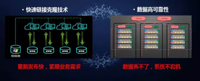 极简灵活的副本机制,能够支持1~6副本,最高9个9数据高可靠性,节点/磁盘故障,数据自动重建。同时支持SSD和内存缓存技术,每分钟可快速发布100个桌面。