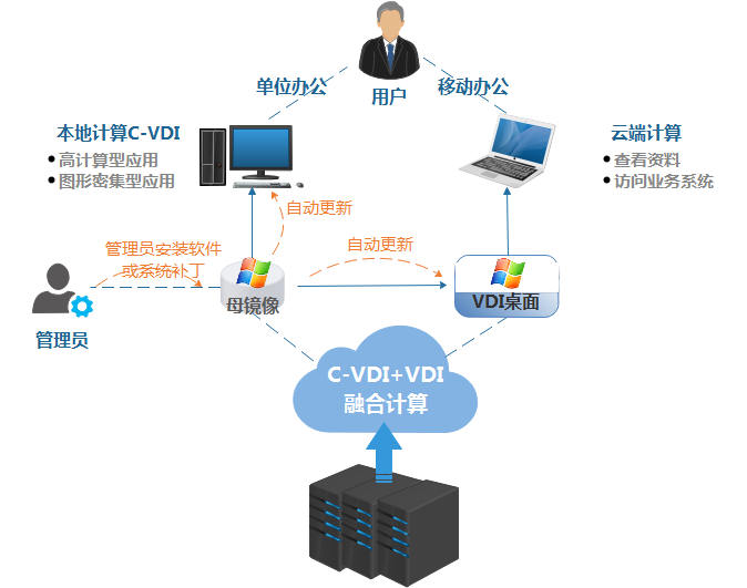 支持C-VDI+VDI融合计算,同时满足用户不同场景的桌面使用需求,管理员编辑母镜像即可统一更新至云端和本地两种桌面模式