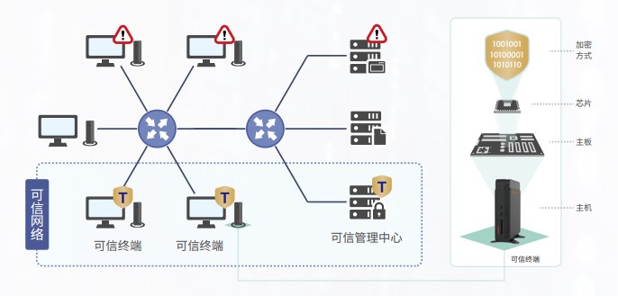 此外,升腾针对可信智能终端推出了相匹配的可信管理方案,该方案以可信加密模块为依托,打造可信网中网,构建全国产化自主安全可控计算环境。可信智能终端是在高性能的基础上,整合可信模块和国产加密算法、智能认证登陆识别、统一管控平台等技术要素,打造云管端三位一体的信息化应用平台,变被动防御为主动免疫,开启计算机进入“主动免疫时代”。