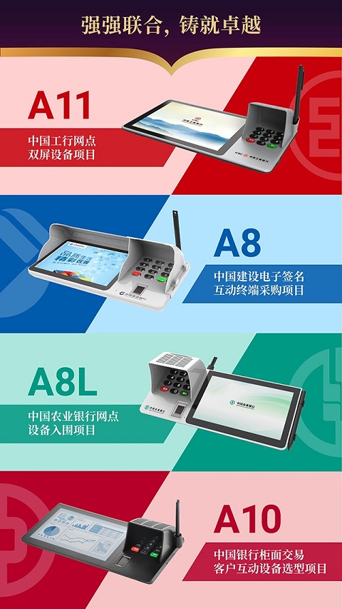 乘势而上,再创新局!作为无纸化解决方案的一线品牌,升腾电子签名柜外清以领先佳绩成功入围中国工行、中国农行、中国银行、中国建行!本次荣耀入围四大行,不仅是对升腾资讯产品创新能力的肯定,更是对专业技术和服务的高度认可,力证了升腾资讯在金融领域十六年的深耕沉淀和深厚实力。